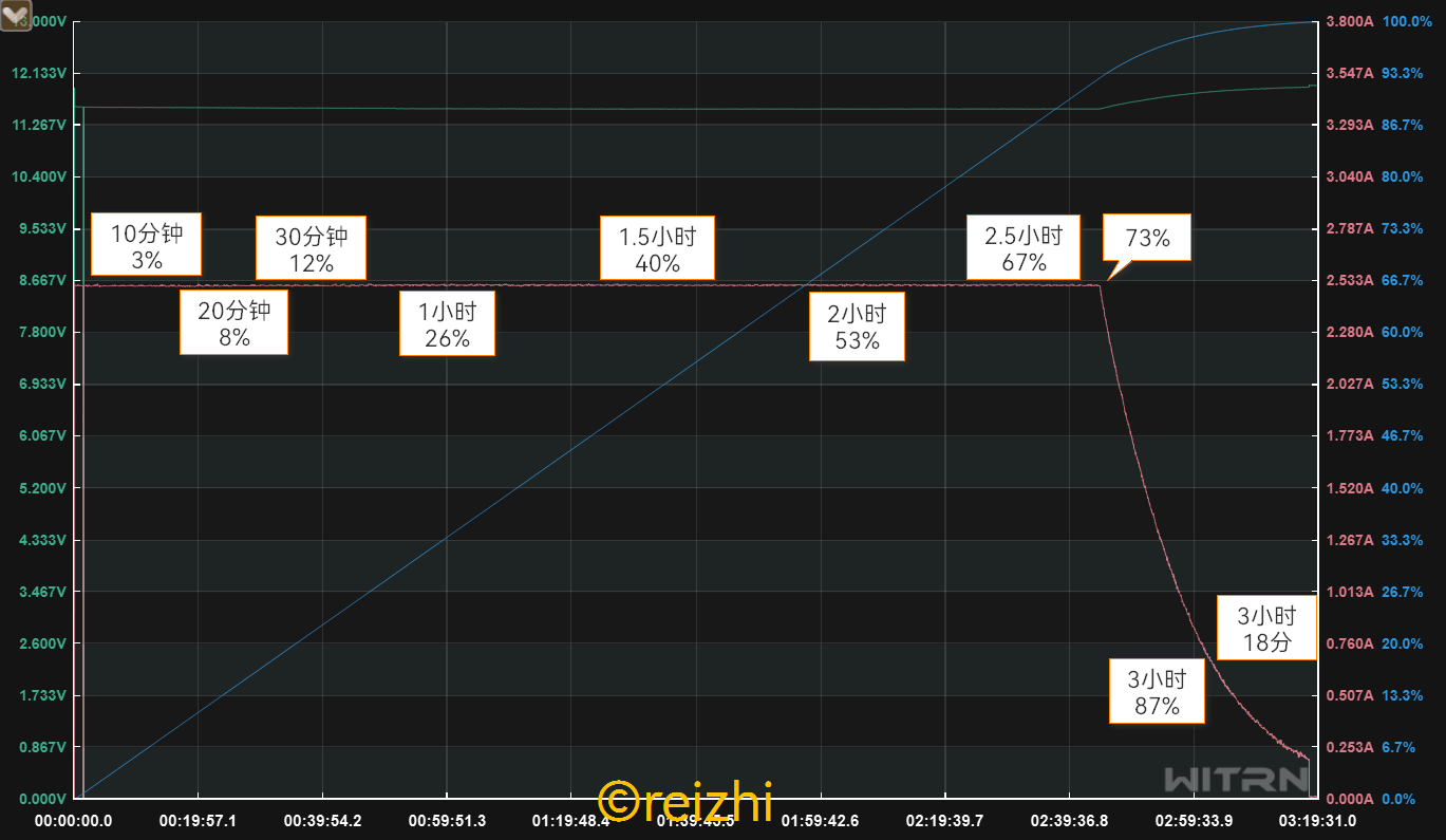 在室温 20 度的环境从 0% 开始对 PB521 进行充电,充满全程耗时 3 小时 18 分钟,PB521 没有出现类似 PB502 显示 100% 但实际还有涓流充电的情况。由于室温较低,PB521 在前 2.5 小时左右都能够维持 30W 的自充功率,并在 73% 左右时开始逐渐降功率。