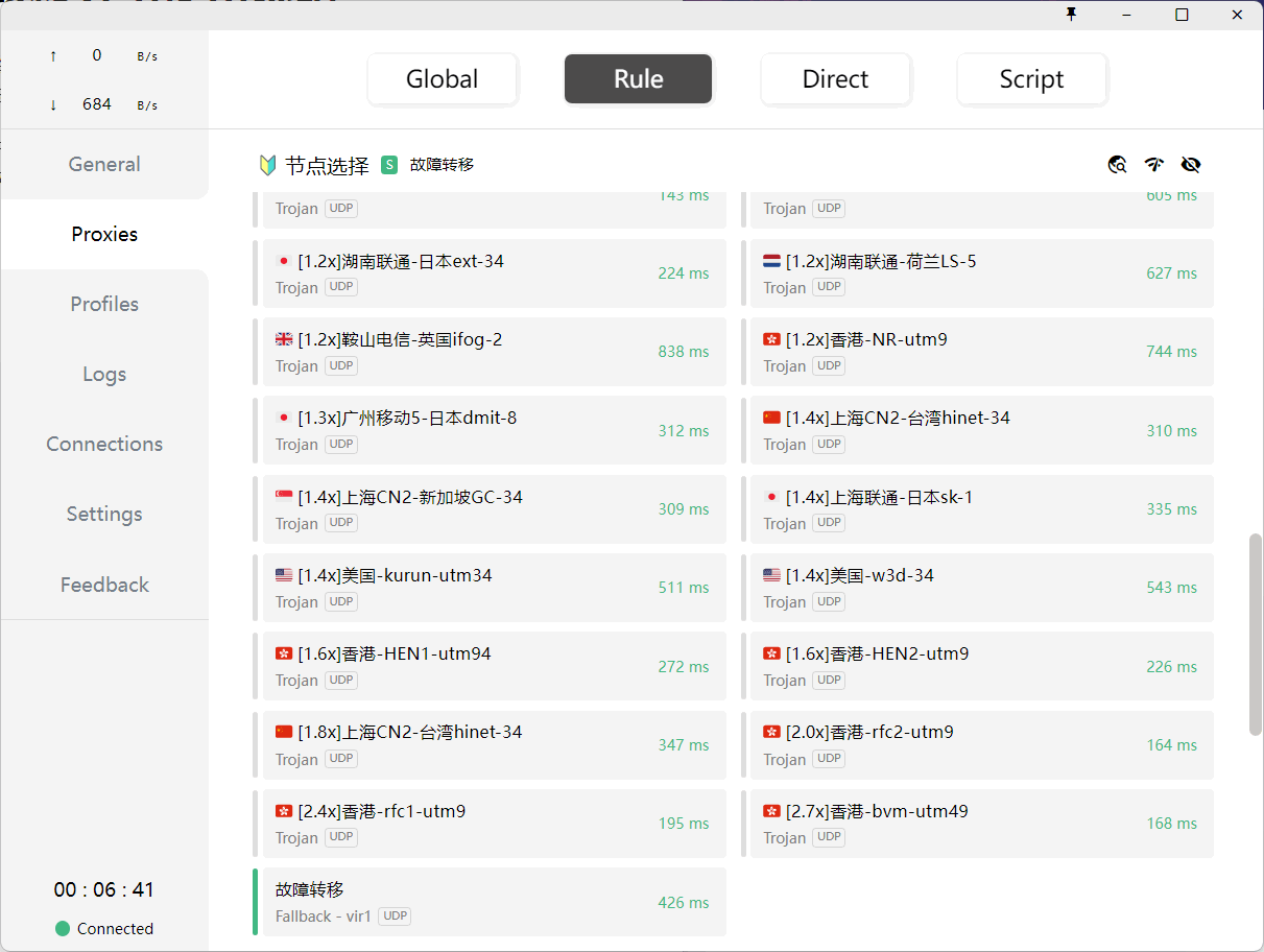 故障转移分组位于规则组的最后,Clash 在启动时会自动检测所有线路的可用性,并且按照排序自动选择第一个可用的线路。