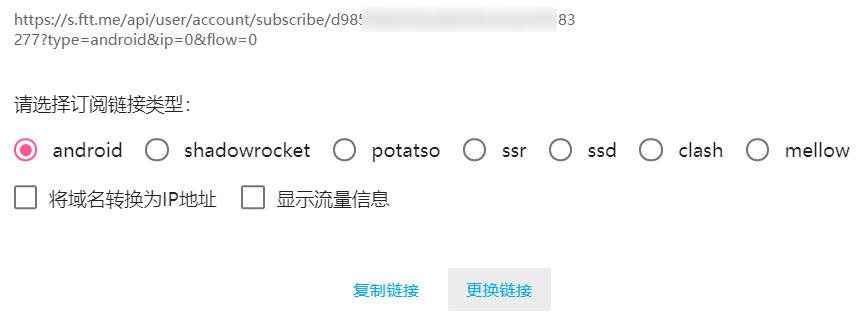 由于订阅链接内包含了每个账户唯一的 key,所以在拉取服务器时并不要求登录帐号。所以在任何情况下都不要将订阅链接与他人共享。如果泄露了订阅链接,通过网站修改 ss 密码和登录密码都是无效的。正确的操作方式是点击“订阅链接”按钮,再点击“更换链接”。