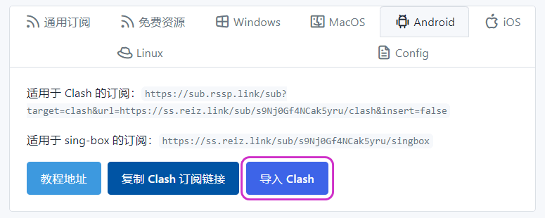 打开网站(注册账号的网站)的首页,依次点击:Android - 导入Clash。(或者选 Windows 也可,是一样的)