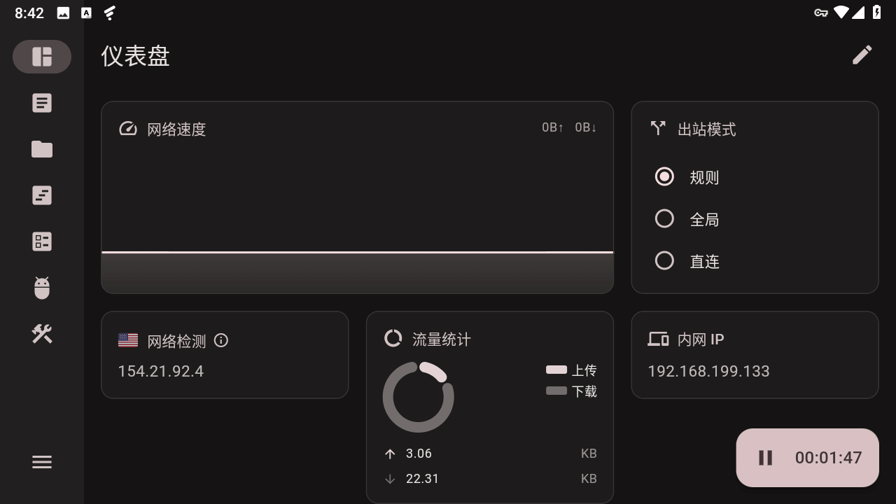 出站模式务必使用默认的“规则”,如果遇到 Play 商店不能下载应用的问题,可以临时选择“全局”。切勿日常一直使用全局。