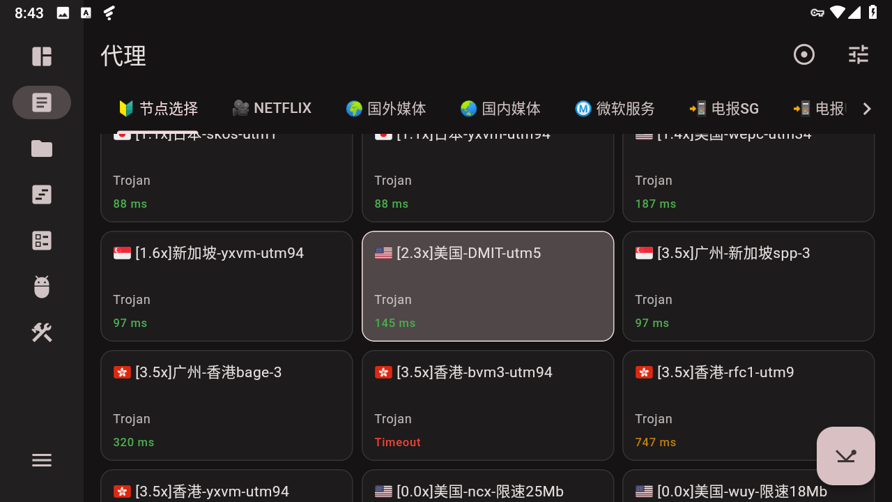 点击底部“代理”图标,再点击右下角的测速图标,等待测速完成后,在节点选择分类里任意选择一个绿色数字的线路。