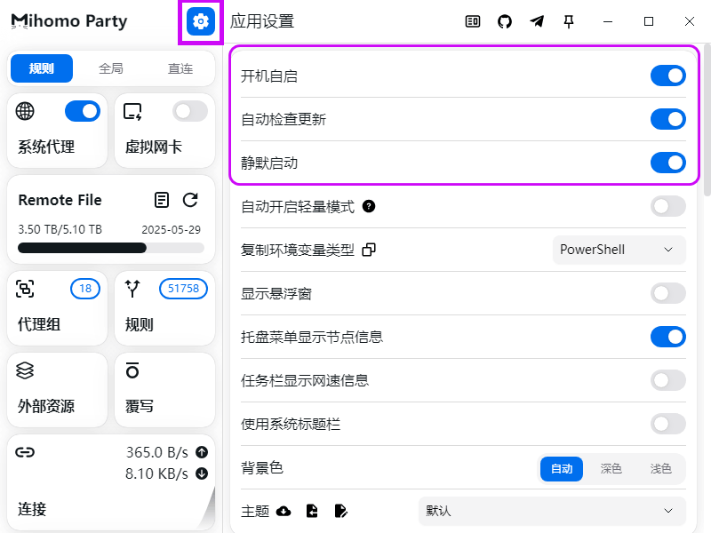 点击左侧上方的齿轮图标,在右侧开启“开机自启”,“静默启动”,最后在左侧开启“系统代理”即可开始科学上网。
