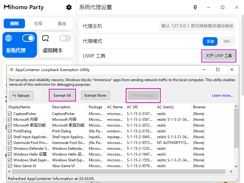 如需对 UWP 应用(即磁贴应用)设置代理,点击左侧“系统代理”,点击右侧“打开 UWP 工具”。在弹出的窗口中点击 Exempt All,再点击 Save Changes 即可。