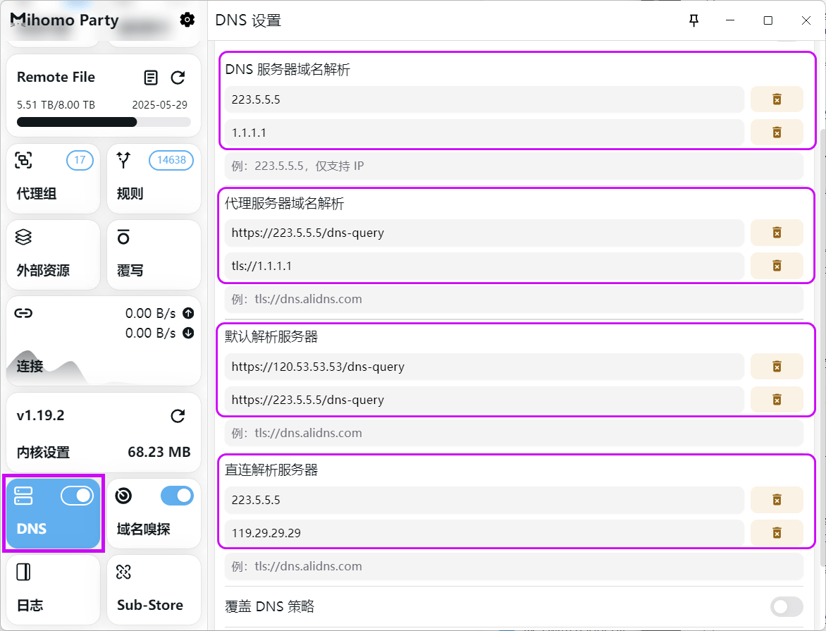点击左侧的“DNS”,在右侧开启 IPv6(蓝色为开启)。DNS 服务器域名解析和直连解析服务器按下图设置,其他可使用默认。